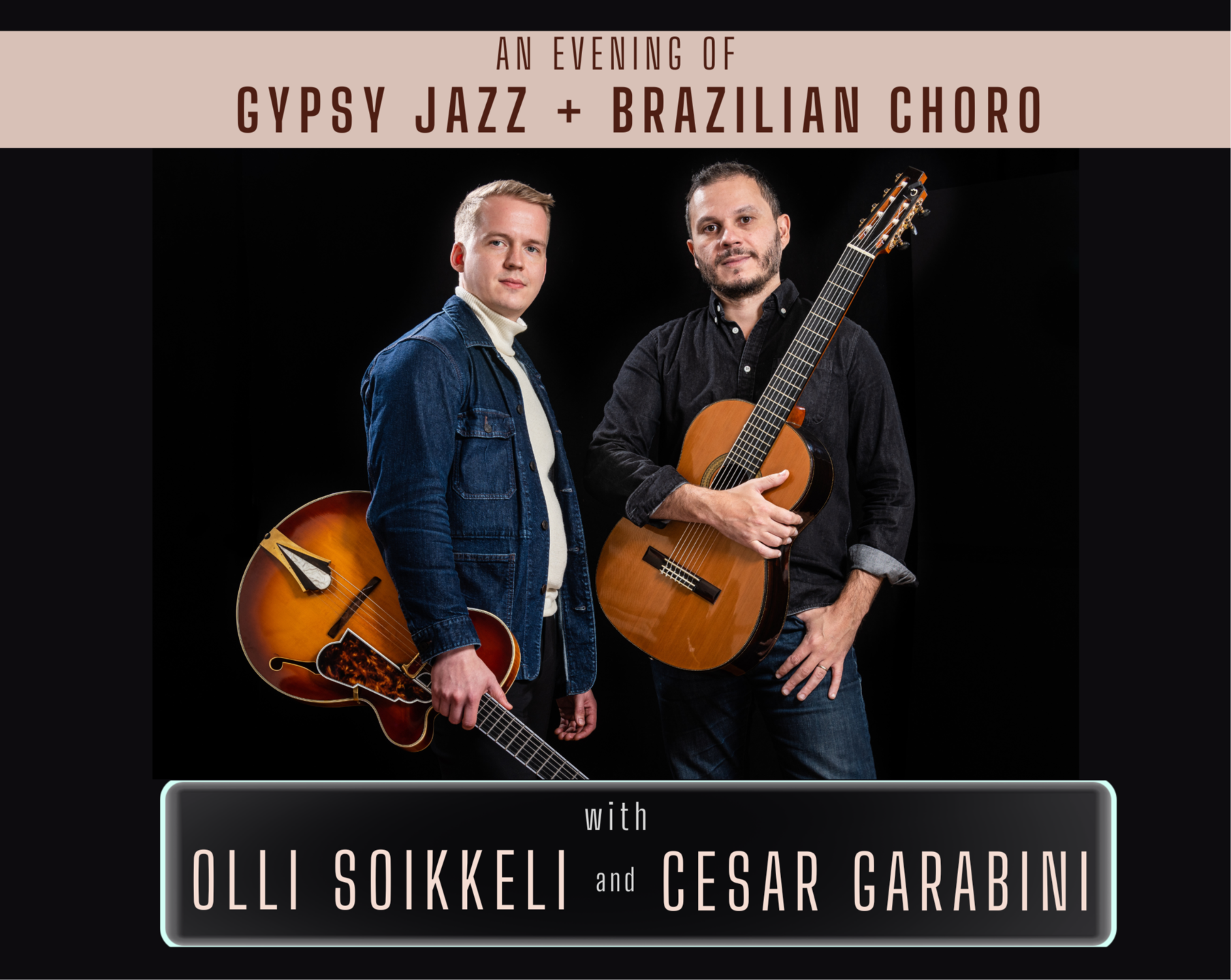 Born in Finland and now based in New York, Olli Soikkeli is a master of Django-style Gypsy jazz, acclaimed for his swinging, lyrical playing on stages from Europe’s top jazz festivals to New York’s Town Hall, Birdland, and the Blue Note. Joining him is Italian-Brazilian seven-string virtuoso Cesar Garabini, a leading voice of Brazilian choro whose work has been featured at Jazz at Lincoln Center, the Museum of Modern Art, NPR, and NBC. Together, they bring two rich musical traditions into an intimate, spirited conversation that blends dazzling technique with deep, soulful groove.